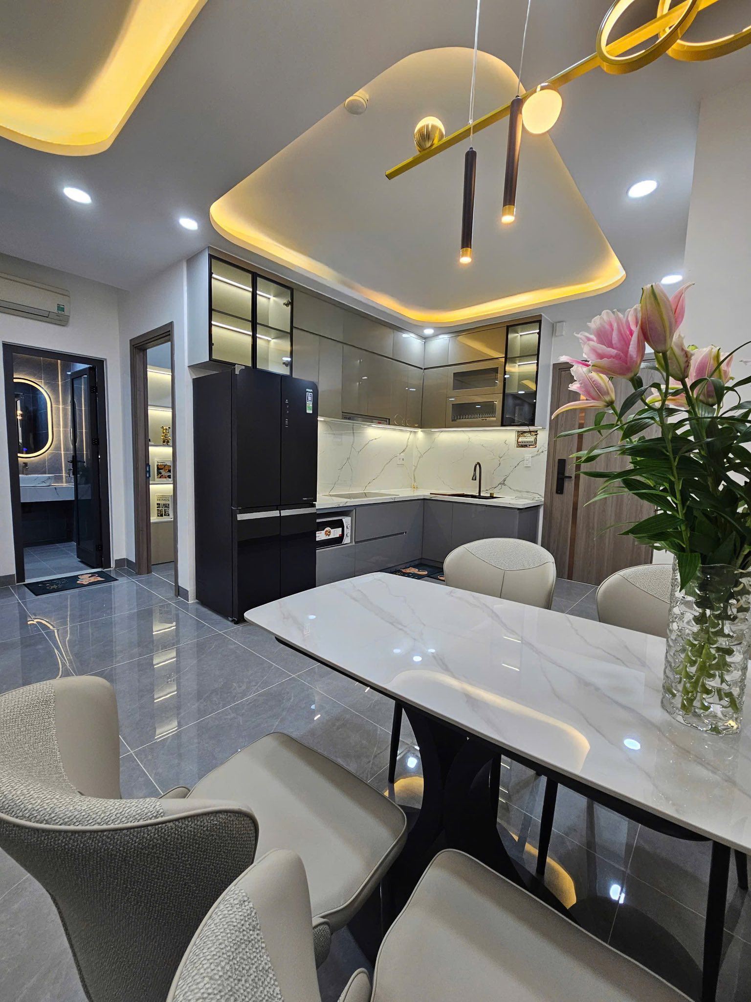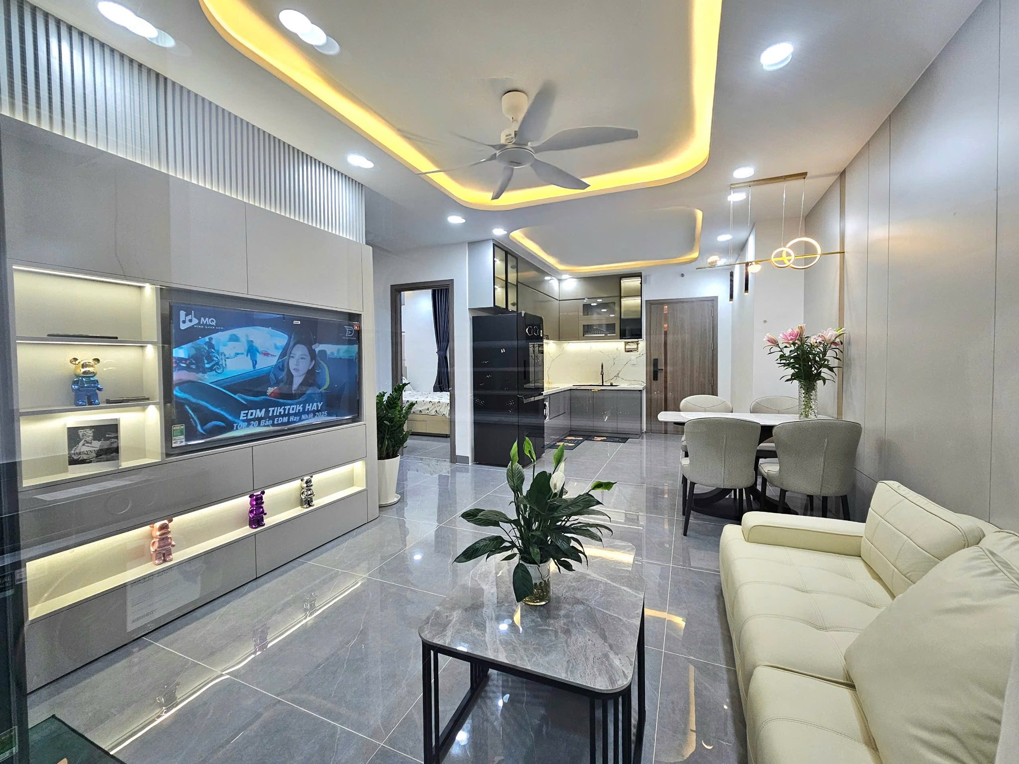 – Phòng khách thoáng sáng và bếp mở hiện đại